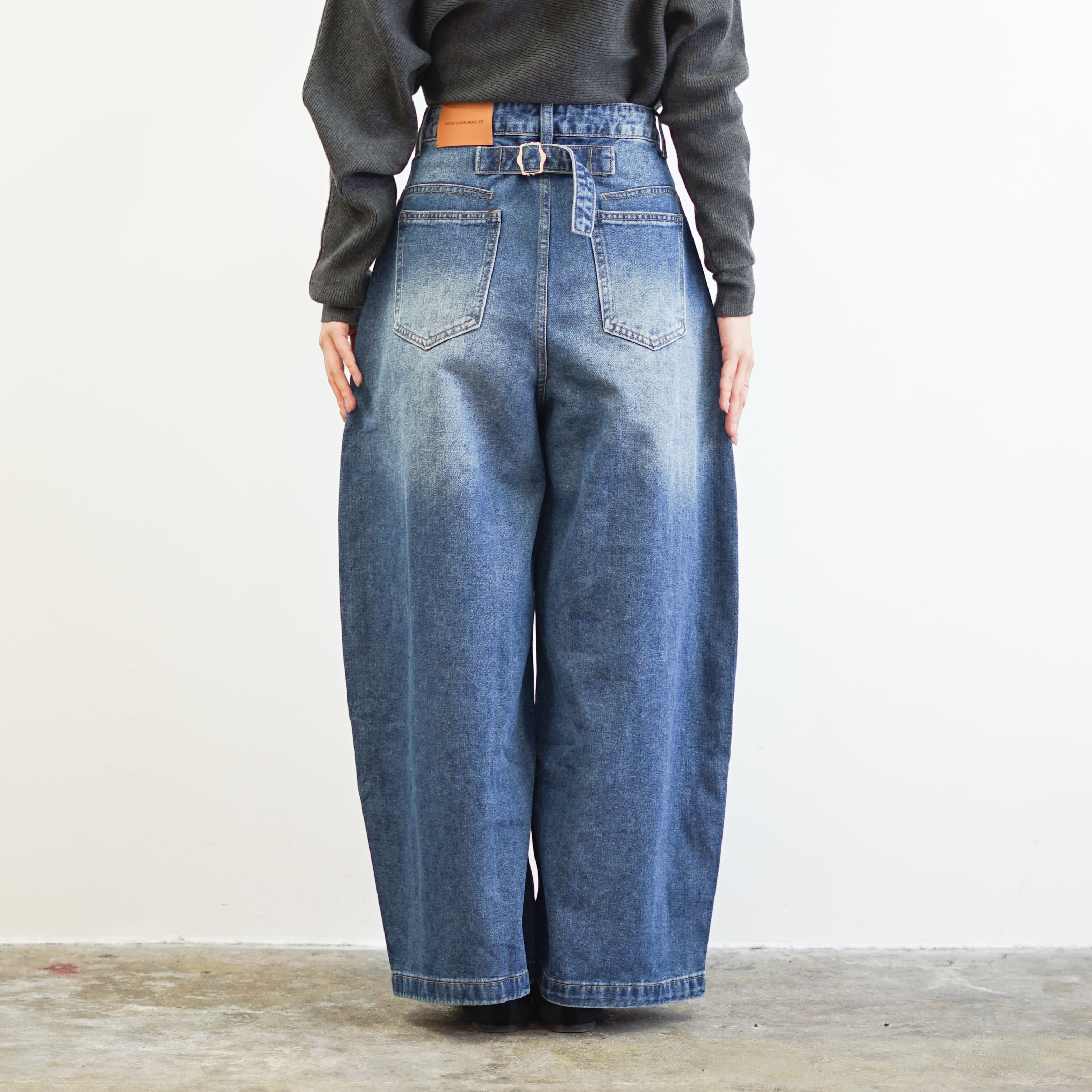 トレンド感のあるバックベルト付きワイドカーブデニムパンツ