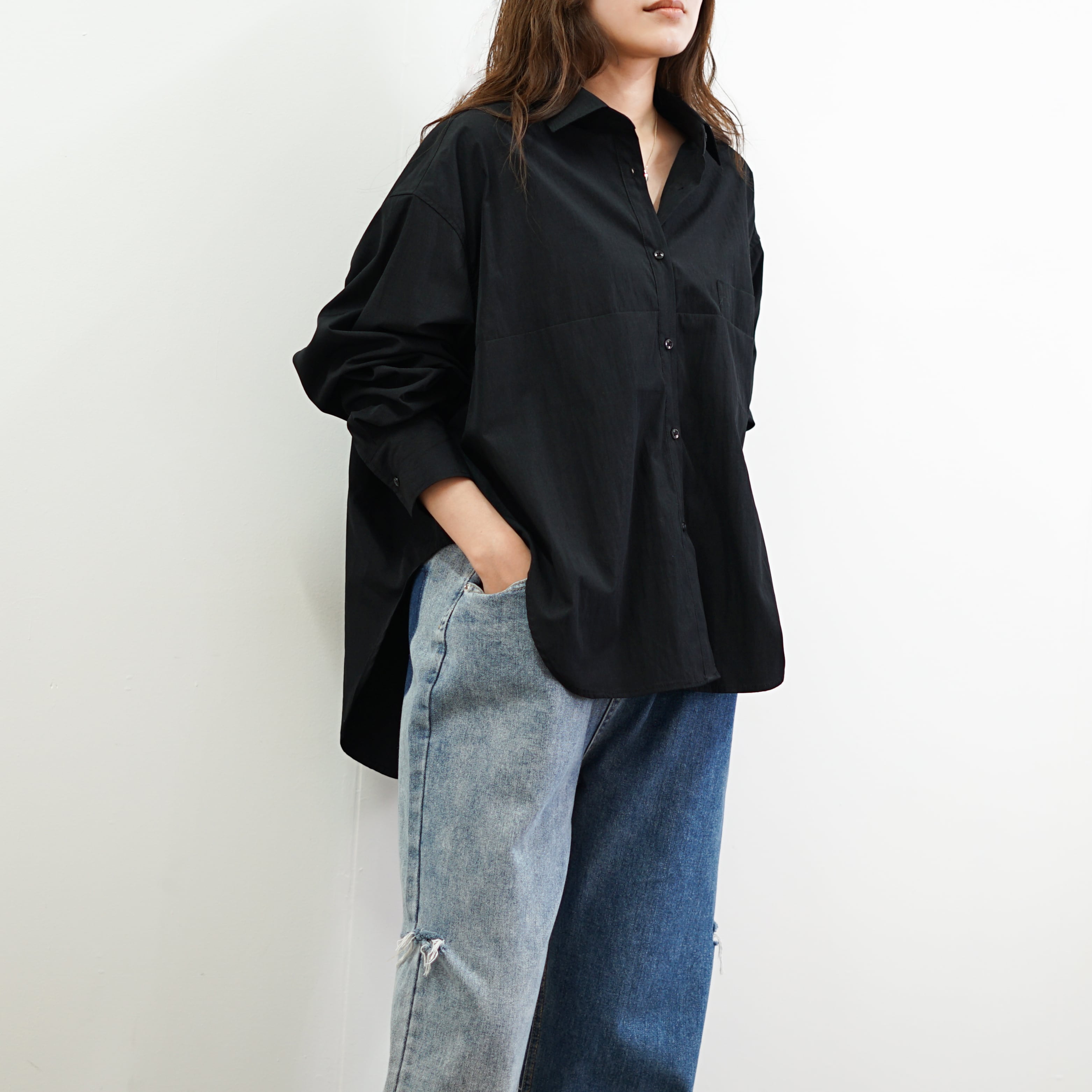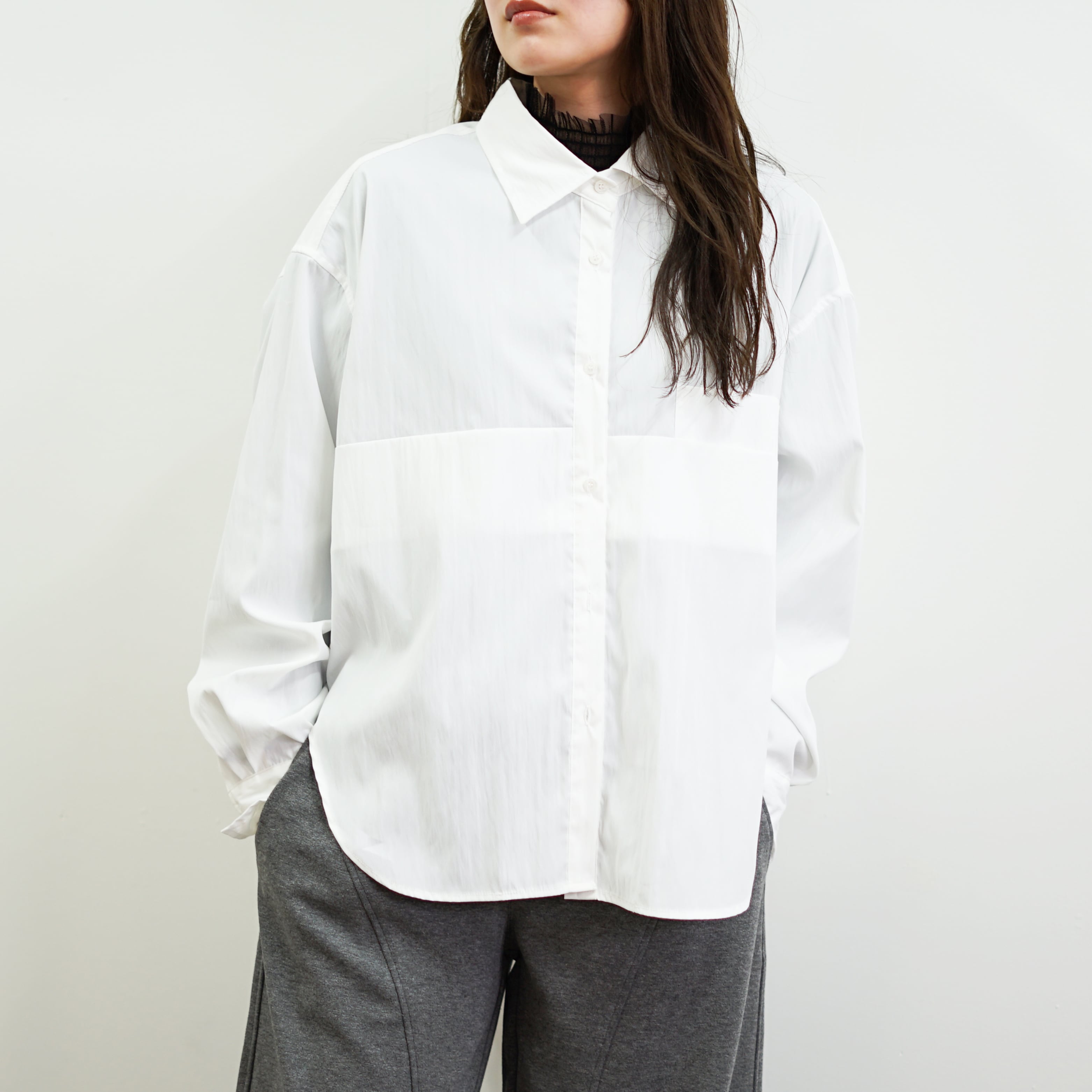 シンプルながらフロントとバックの切替がアクセントになりバランスのとれたシャツは1枚で着てもレイヤードしても様になるアイテム!