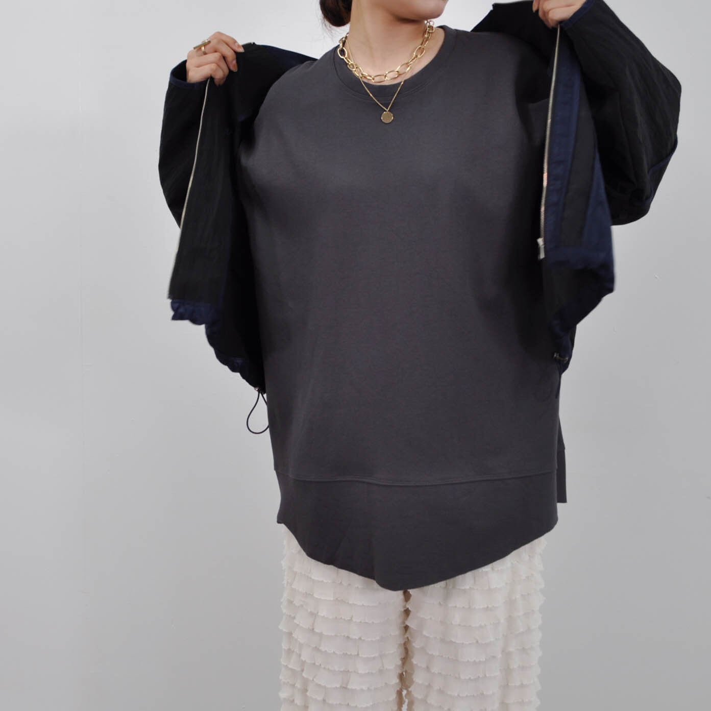肌離れする程よくオーバーなサイジングにすることで着心地◎