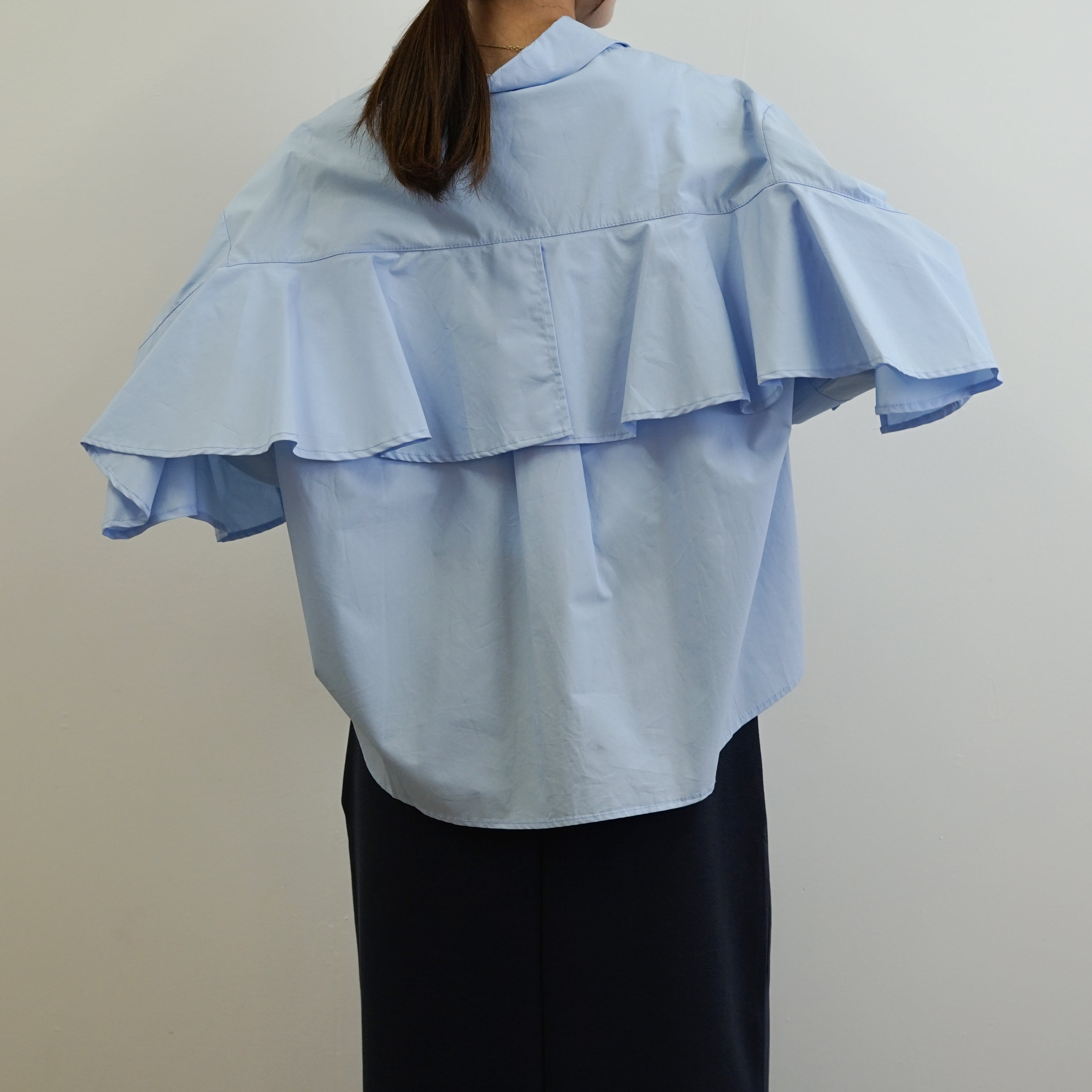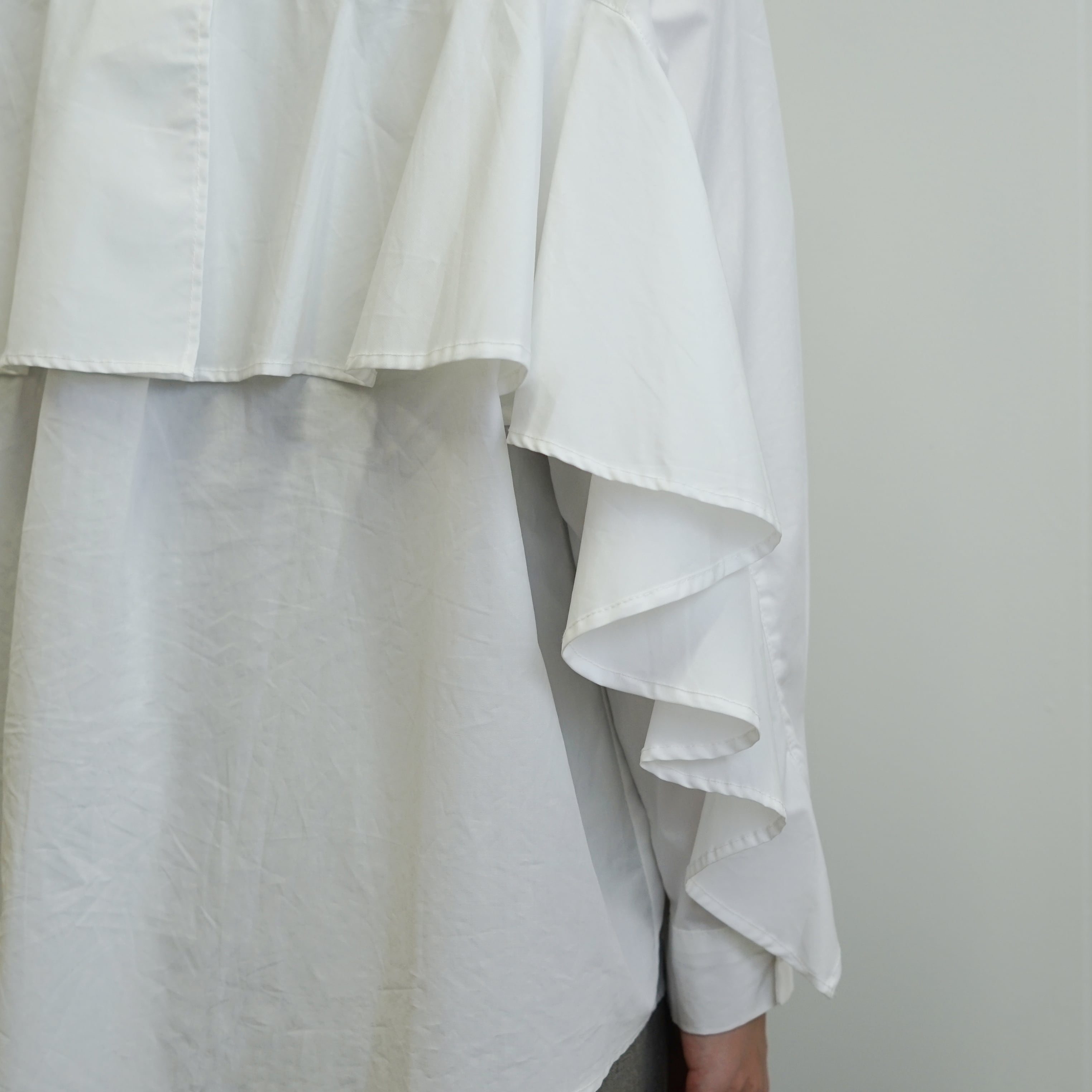 袖から背中にかけてたっぷりとあしらわれたフリルが動きをプラスし後ろ姿まで美しく演出。